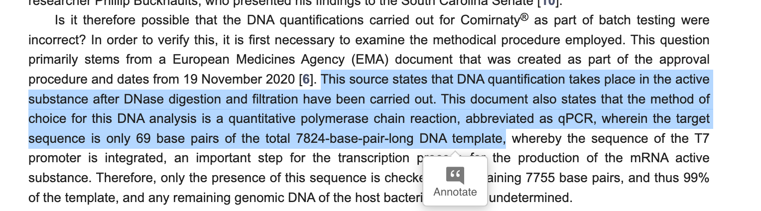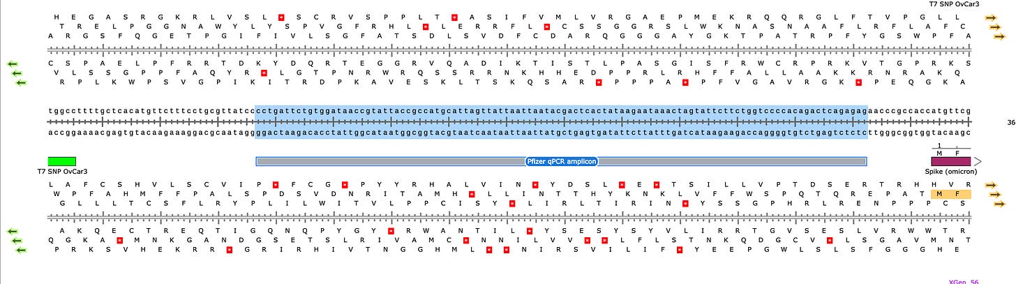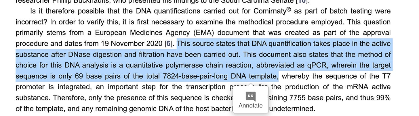 The documents we have on hand have Pfizer qPCR primers using SYBR green (no TaqMan Probe) and the amplicon is 106bp long. I pulled these from an EMA document that is covered on one of my substacks. I don’t know where they got the 69bp amplicon from but the longer the amplicon, the more it under-quantitates the DNA when DNaseI is involved. It does rest on the most highly transcribed part of the DNA which is a great way to suppress the signal.