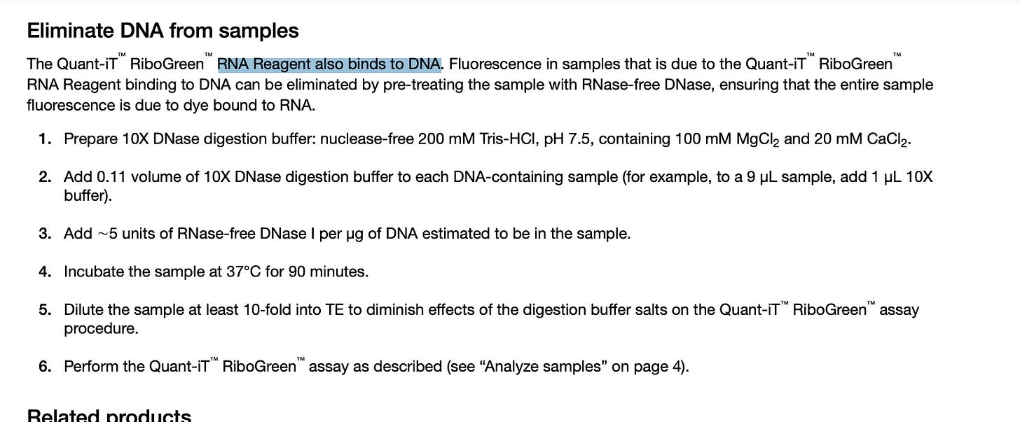 This is where one flaw in the paper emerges. RiboGreen is NOT a RNA specific dye. It in fact binds DNA 2X more than RNA and the protocol recommends the use of DNaseI before using it to assess RNA quantity. Why is it called RiboGreen? Because PicoGreen binds DNA over RNA 100:1 so RiboGreen is RNA favored at 2:1.