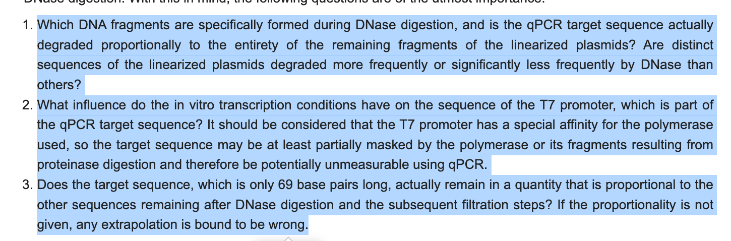 This is covered in Konig’s text and aligns with our results and Moderna’s own patents which state qPCR underestimates the DNA quantitation problem.