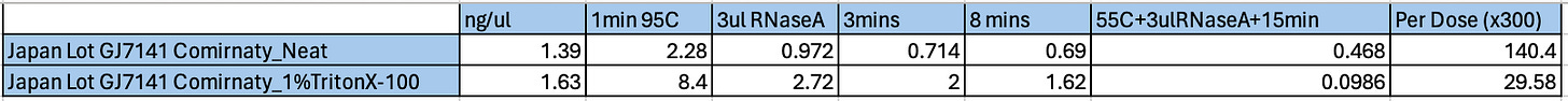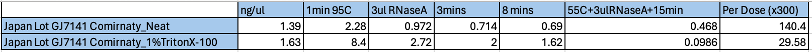 A full dose is 300ul so 300X these numbers are seen on the right. These are cleanest lots we have (least DNA). It is interesting that the TritonX-100 signal degrades more with 55C and more RNaseA. This implies the PicoGreen can get into some LNPs but the RNaseA (much larger molecule) cannot until the detergent and heat are applied.
