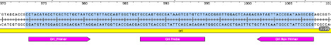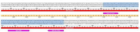 Figure 2. Pfizer bivalent vaccine assembly of the RNA-seq library. Annotated with SEB/FCS, spike insert (red), bacterial origin of replication (yellow), Neo/Kan resistance gene(green), F1 origin (yellow) and an SV40 promoter (yellow and white).