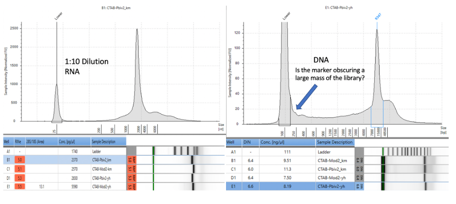 Figure 6. Agilent Tape Station™ electrophoresis demonstrates 23.7ng/µl – 55.9ng/µl of RNA (left). 7.5ng-11.3ng/µl are observed on DNA based Tape Station™. While the DNA electropherogram shows a peak suggestive of a full-length plasmid, this sample is known to have high amounts of N1-methylpseudouridine RNA present. DNA hybrids with N1-methylpseudouridine mRNA may provide enough intercalating dye cross talk to produce a peak. The sizing of the peak on the RNA tape on the left is shorter than expected. This may be the results of N1 methylpseudouridine changing the secondary structure or the mass to charge ratio of the DNA.