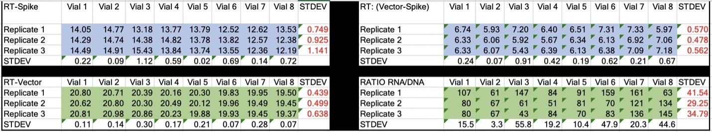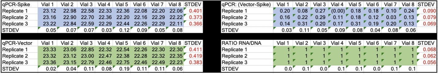 Table 2. CT values for Spike and Vector during qPCR (DNA only). Standard deviation for the triplicate measurements run horizontally in black font. Standard deviation for vial to vial run vertically in Red. Delta CT or (Vector CT minus Spike CT) represents the ratio of Spike to Vector DNA and should = 1.
