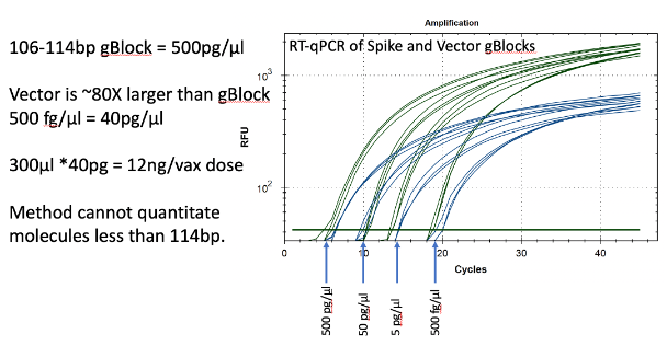Table 3. CT values for Spike and Vector during RT-qPCR (RNA+DNA). Ratio of RNA:DNA ranges from 43:1 To 161:1. EMA allowable limit is 3030:1. This is 18-70 fold over the EMA limit.