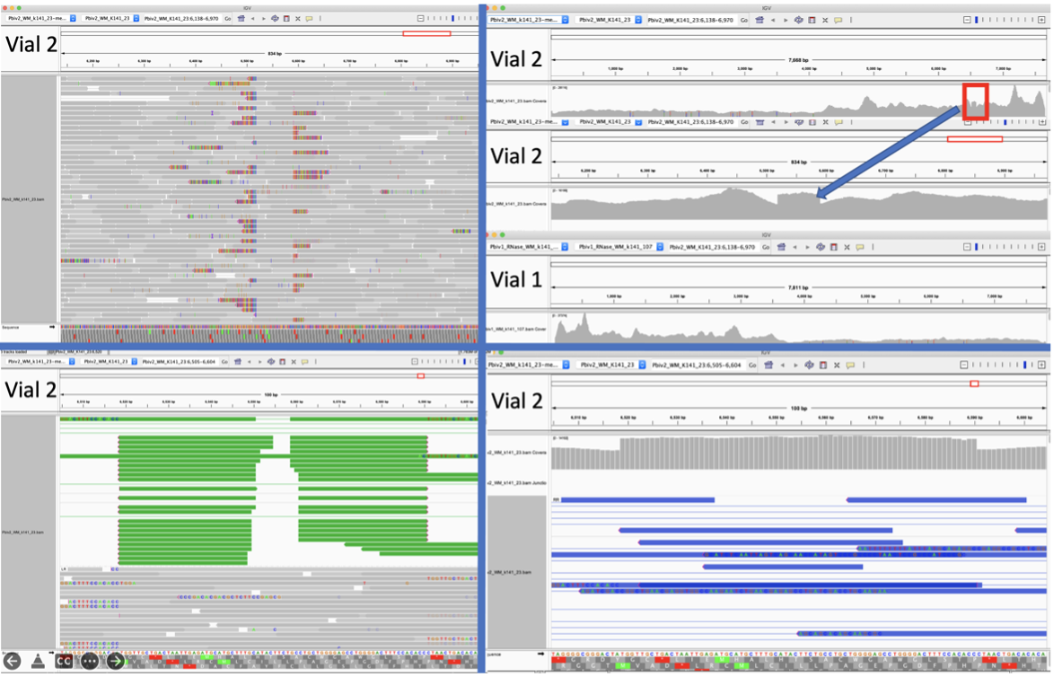 Figure 5B. IGV view of the read coverage over Pbiv2_k141_23 shows a discrete 72bp plateau in coverage (red rectangle). Editing the Pbiv2_k141_23 reference to include 2 copies of the 72bp sequence, and remapping the sequence data to this corrected sequence shows that the coverage over both vectors is more normal with no coverage plateau in Pfizer vial 2.
