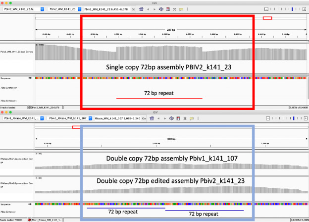 When references have a single copy of the 72bp repeat and the sample has two copies of the repeat, reads should pile up to twice the coverage over the single copy 72bp loci as seen in Figure 5A. To test this hypothesis, we added a second 72bp sequence to the shorter plasmid assembly and observed that the reads map without artifact and no evidence of heteroplasmy (Figure 5B).