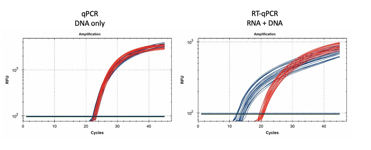 Figure 15. 1µl of vaccine boiled in 100µl of Leaf Lysis buffer was subjected to qPCR (left) and RT-qPCR (right) for Vector (red) and Spike (blue). 8 samples were tested in triplicate.