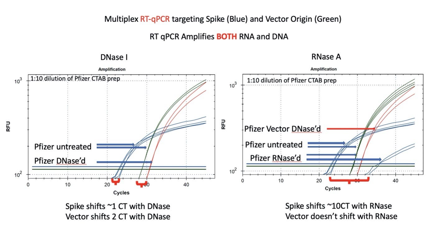 Figure 7. qPCR of Pfizer’s bivalent vaccine with and without DNase I (left) and RNase A (right). Untreated mRNA demonstrates equal CTs for Spike and Vector assays as expected. Vector is more DNase I sensitive than the Spike suggesting the modRNA may inhibit nuclease activity of DNase I against complementary DNA targets. RNase A treatment doesn’t alter the qPCR signal.