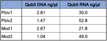 Table 1. Qubit™ 3 Fluorometry estimates 1.04-2.8 ng/µl of dsDNA in the vaccines and 21.8ng-52.8ng/µl of RNA.