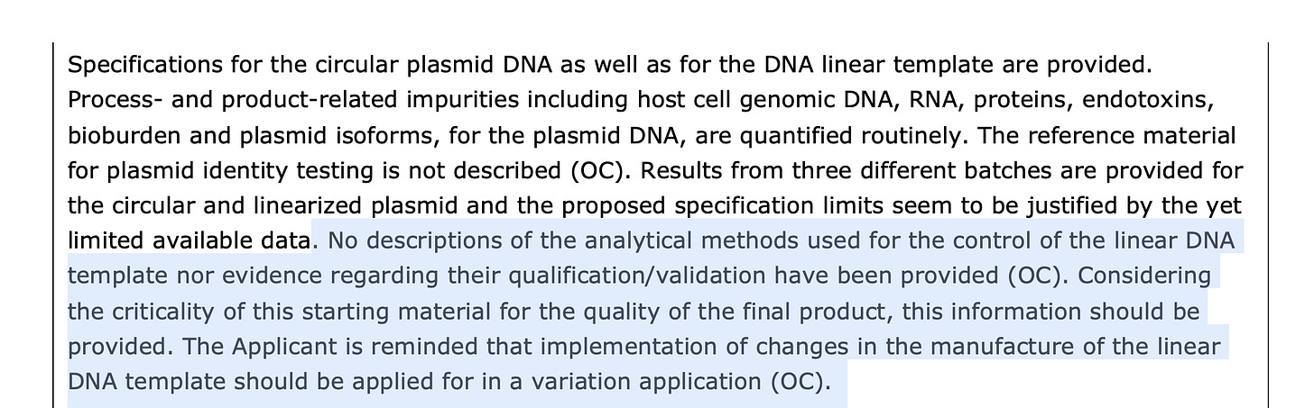 Several examples of concerns raised by the EMA that could lead to a failure to detect the high levels of dsDNA or dsRNA contamination in these vials.