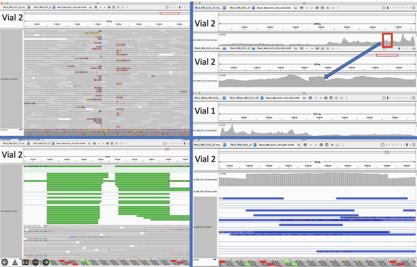 Previous work sequencing the Pfizer bivalent vaccines utilized a method that sequenced both the RNA and DNA in the sample. The RNA-Seq kit employed favored sequencing RNA and under estimated the DNA contamination levels in the vaccine. This made it difficult to assess the % of the plasmid DNA that was linear versus circular DNA. To address this problem, we RNase A treated the sample and sequenced the remaining DNA. RNase A digests RNA into small pieces that can be eliminated with purification. This enabled a deeper sampling of the DNA based molecules without the mRNA sequence obscuring and suppressing the depth of coverage for the plasmid vector.