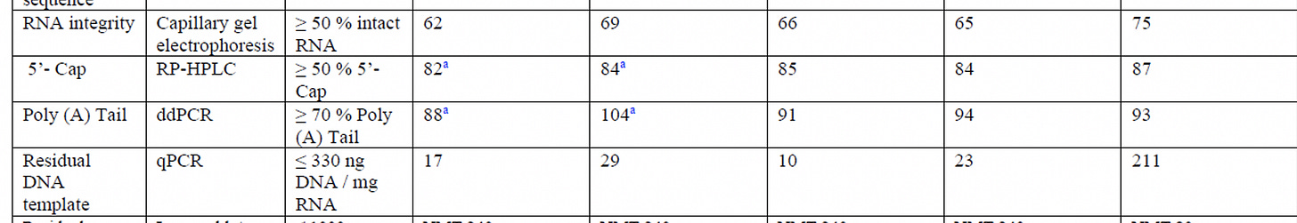 3) The assay to detect residual DNA is a qPCR-based assay with primers on the T7 promoter and Kozak sequence. Presumably the motivation for this assay is high sensitivity to detect what is expected to be a rather trace impurity. This method will not quantify any DNA not containing the target sequence, but should detect the input plasmids sequenced here (I checked and the primers do match).