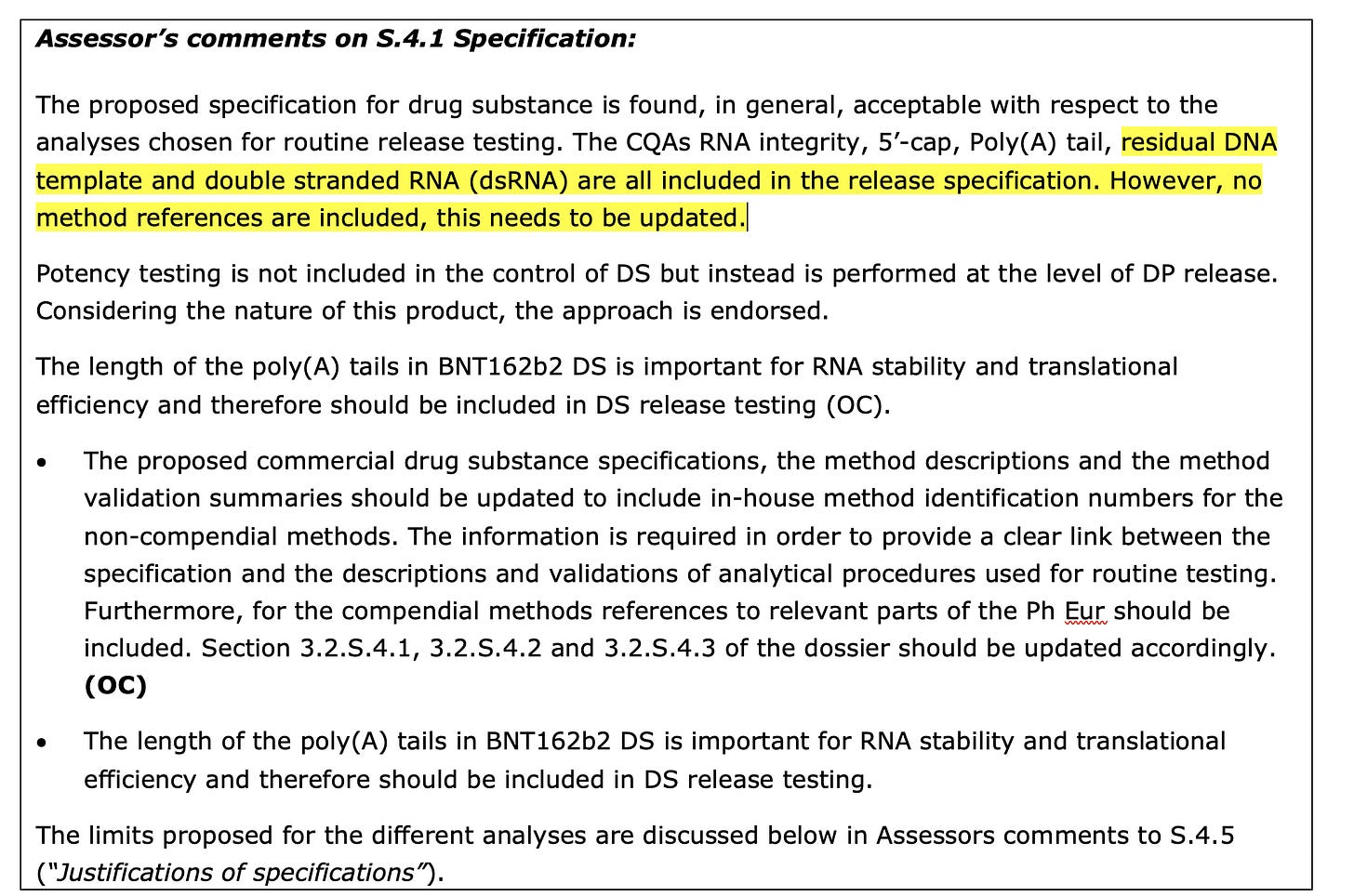 "The specification for residual DNA template was based on the WHO recommendation of not more than 10 ng DNA/dose. Based on these considerations, and assuming a maximum dose of 30μg, the commercial acceptance criterion at release is ≤330 ng DNA/mg RNA. The approach is endorsed. "