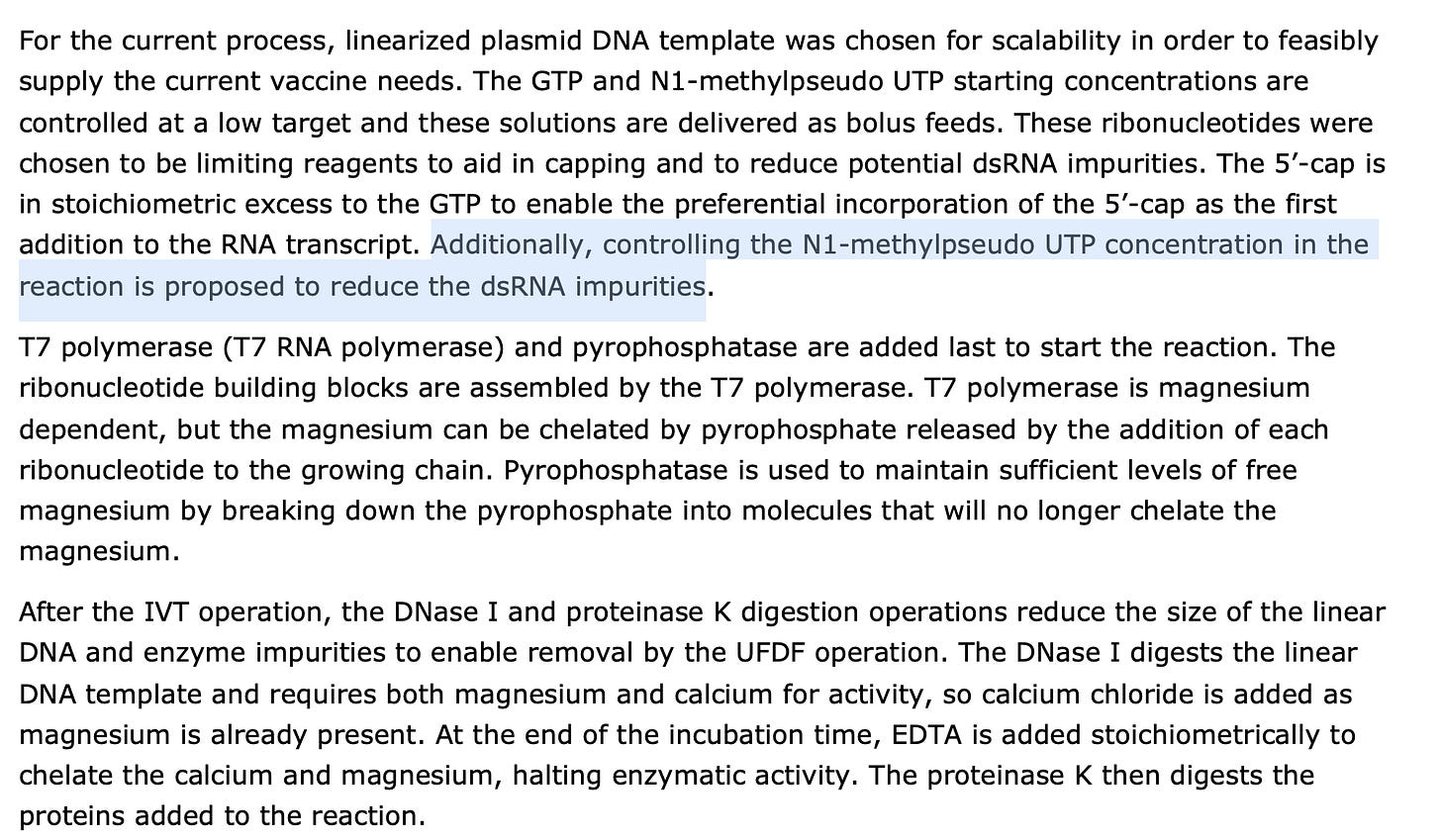1) The manufacturing process uses a linearised DNA plasmid together with T7 polymerase and other reagents to generate the RNA.