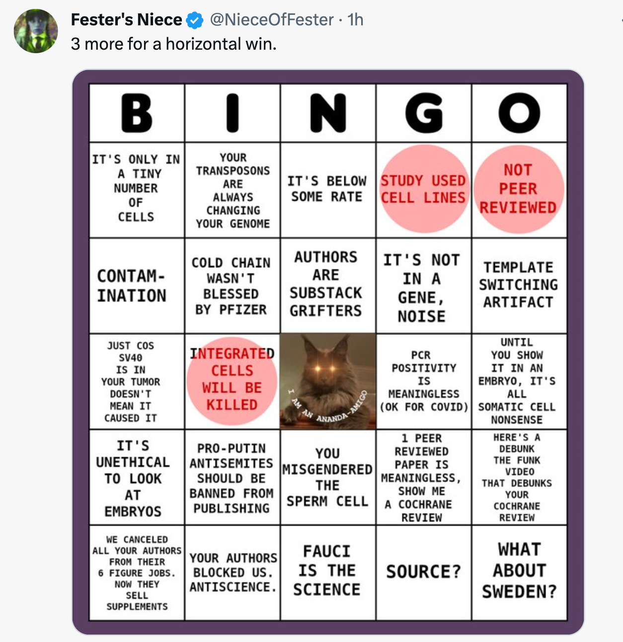 Ananda-Amigo Fester’s Niece decided it was time to play plasmid debunk Bingo as the same tired arguments kept getting recirculated once the existence of the SV40 Promoter/Origin was settled.