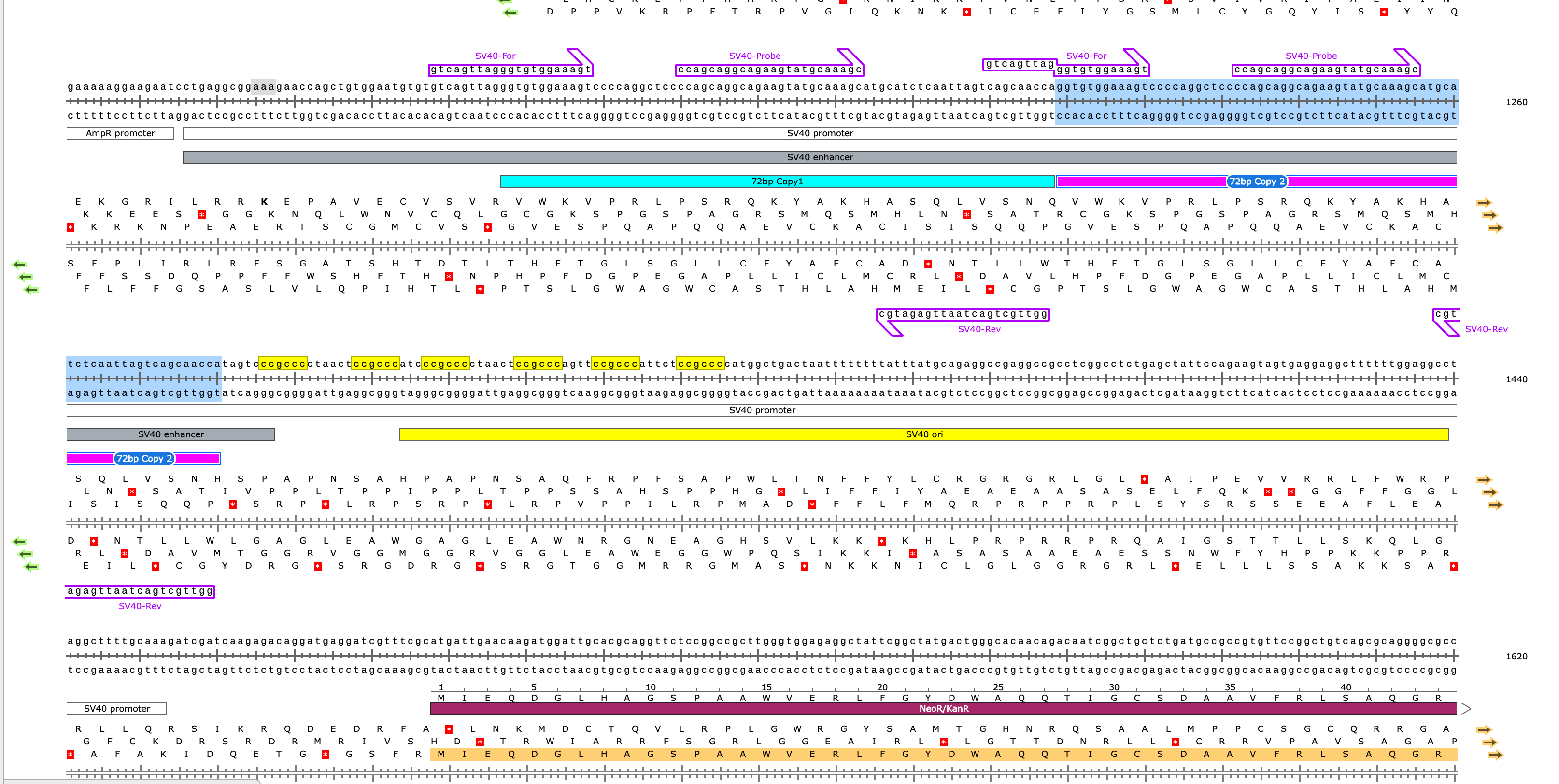 The SV40 Origin is annotated in Yellow, the 72bp tandem repeat from the SV40 Enhancer is in Aqua and Pink, and the promoter in white. The Yellow Highlighted bases are the GC Boxes