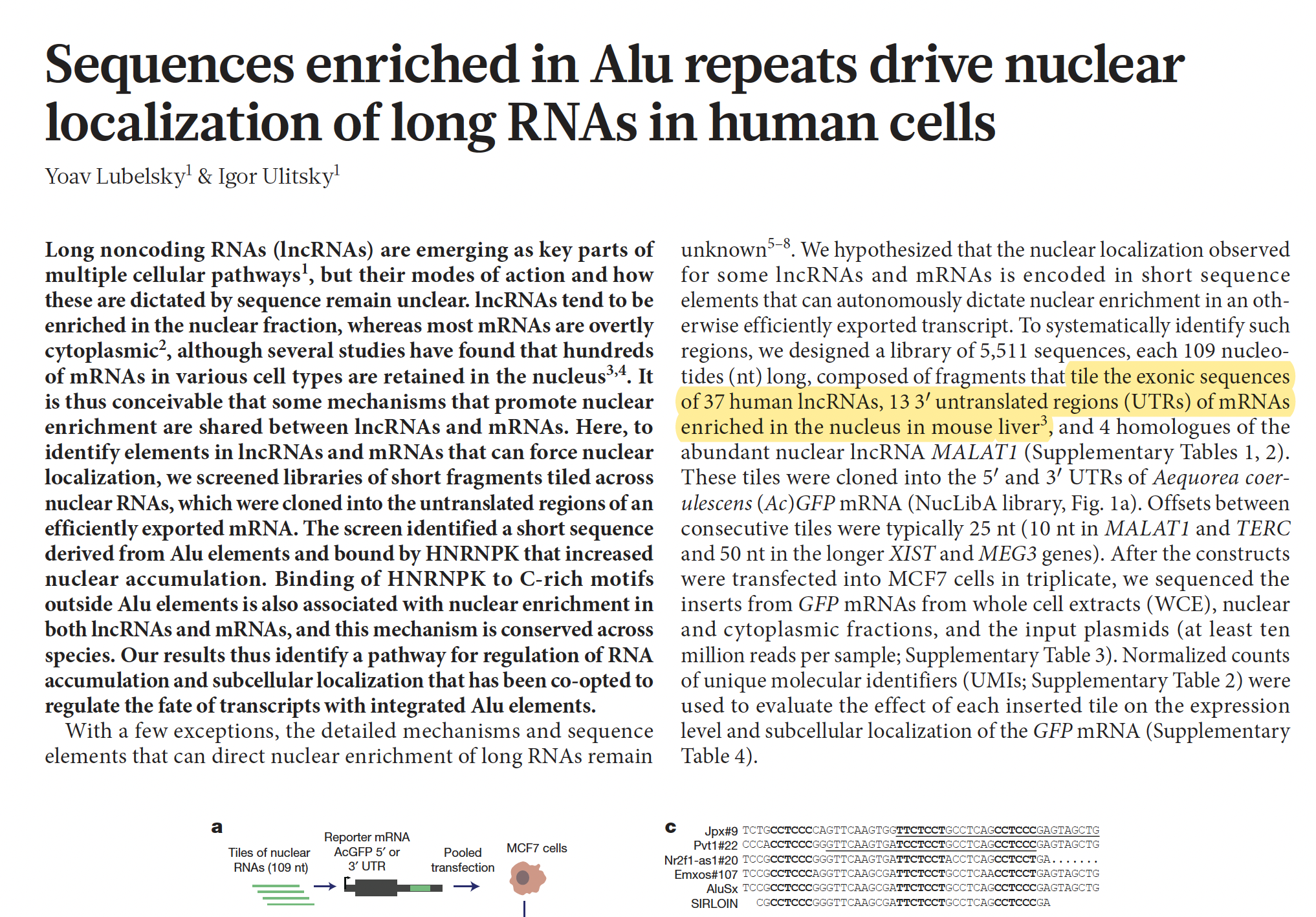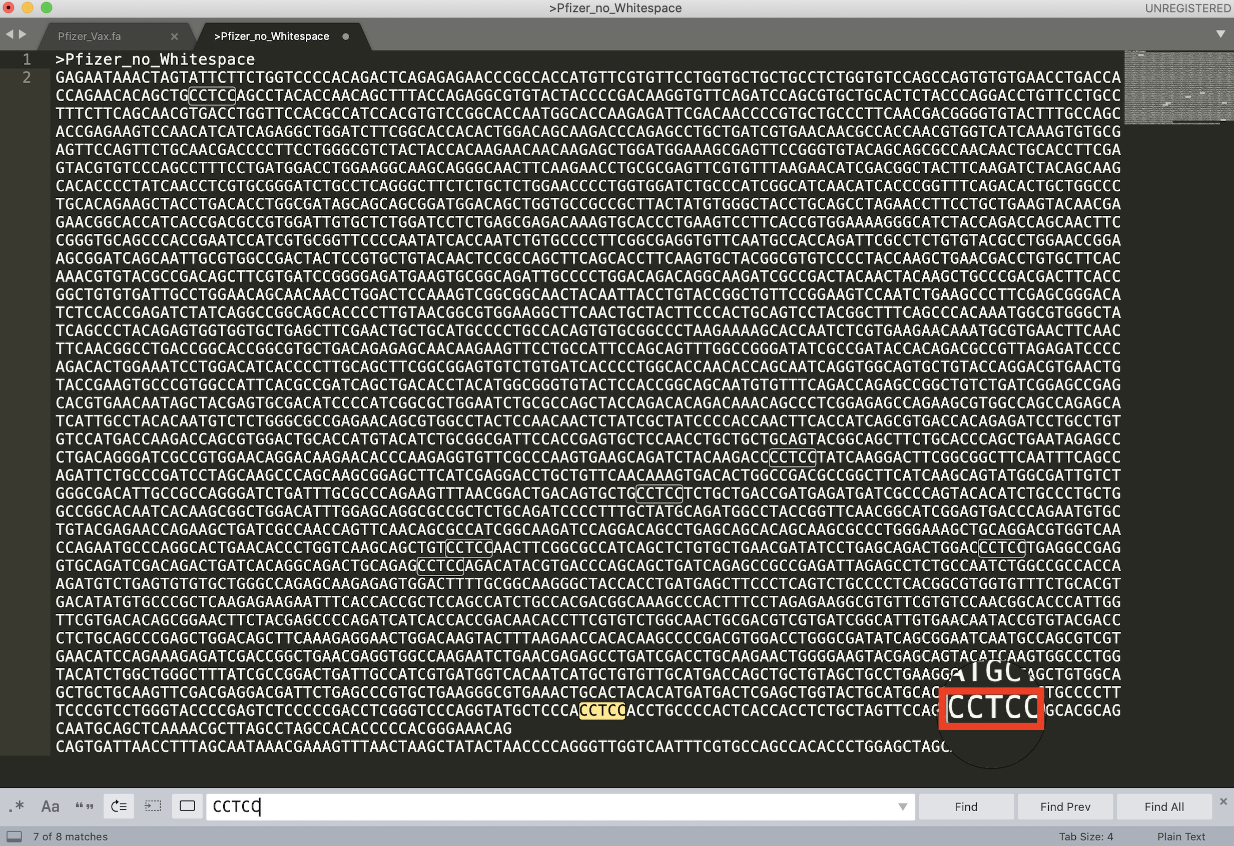 TL/DR: Certain RNA sequences are zip codes for RNA localization in the cell. One known as SIRLOIN (SINE-derived nuclear RNA localization) or CCTCCC is common in RNAs that localized to the nucleus. Its a short 6bp sequence you would expect to see every 4096 bases (4^6) and I can’t find any in SARs-CoV-2 but I was alerted to one being found in the 3’UTR of the BNT162b2. I then searched Moderna and C19 sequences and found 5 of them in the mRNA-1273 and none in C19. If you losen the search up to just the 5mer (CCTCC) you begin to find more in Modern and Pfizer and some in close proximity to each other. This proximity likely matters according to Lubelsky et al. The codon optimization used for these vaccines seems to have introduced these sequences to the mRNAs.