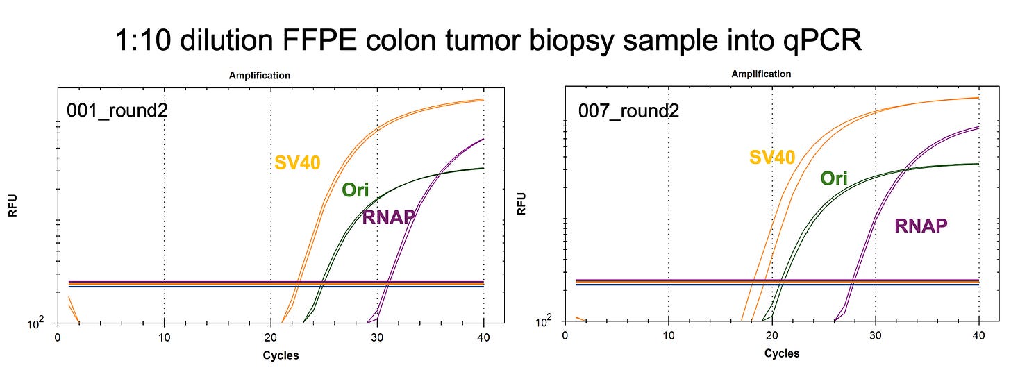 Instead, we observe SV40 promoter and ColE1 Ori offsets with no spike signal and the NTCs are clean out to CT 35.