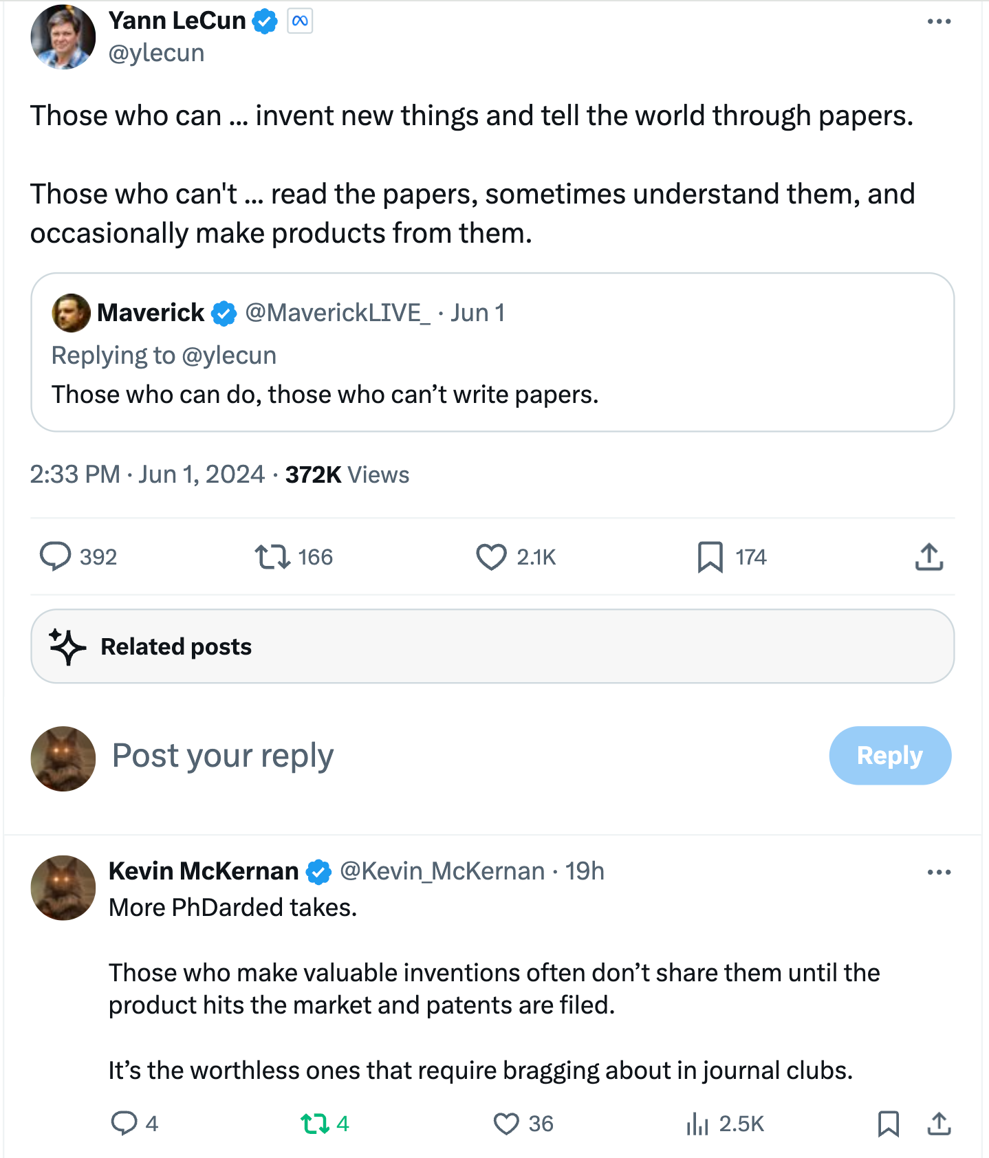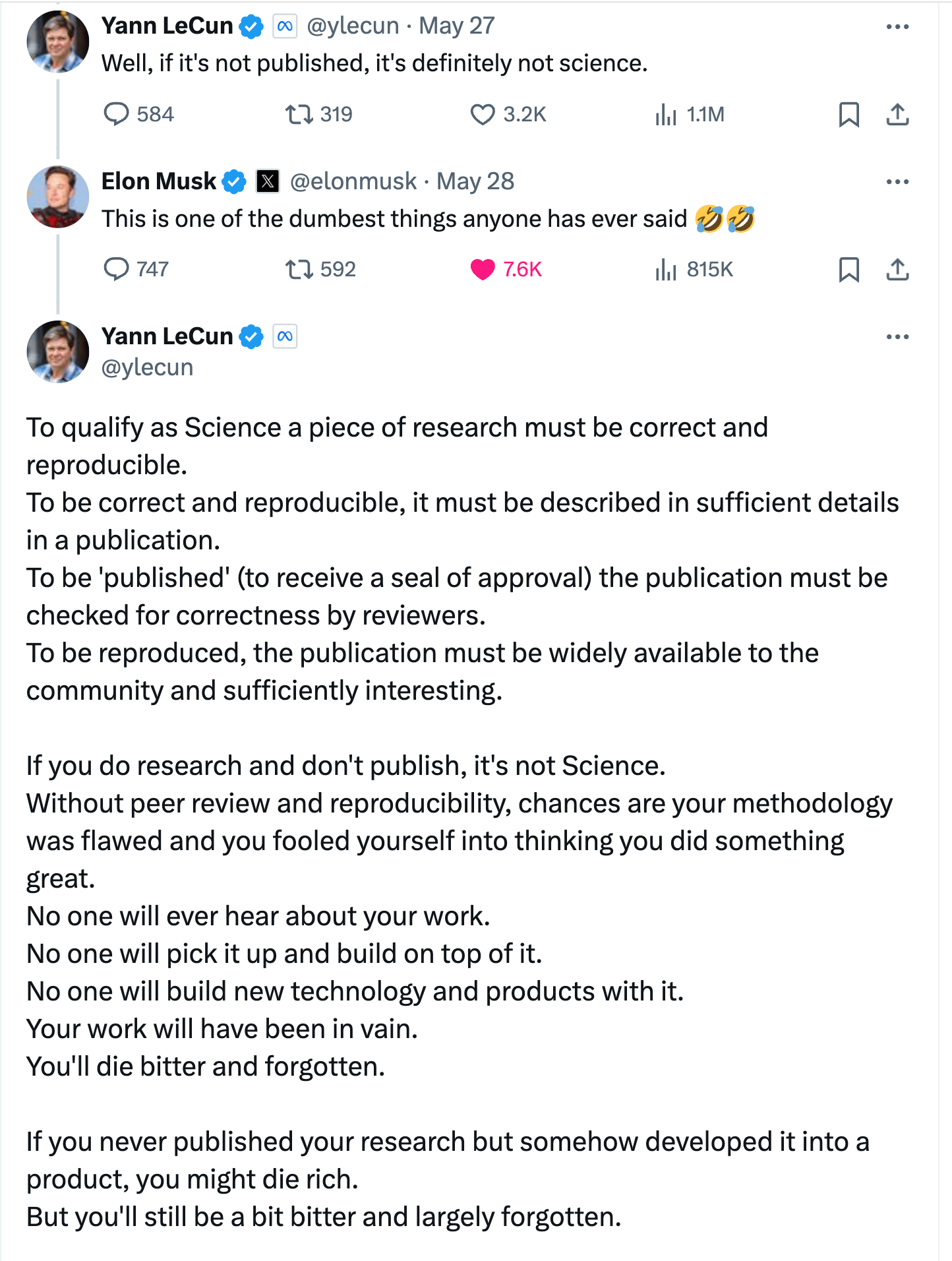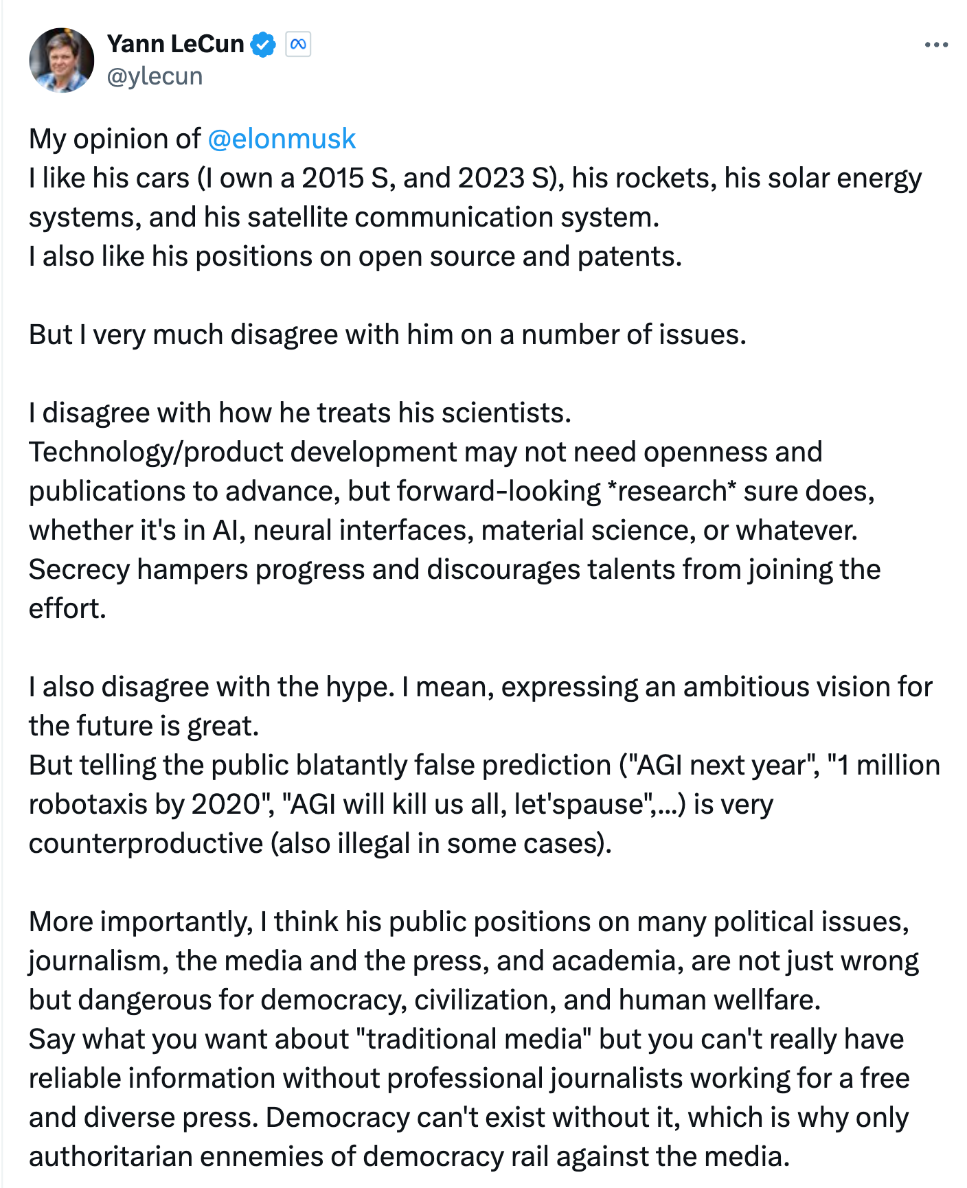 This all started by Yann Citation shaming Elon Musk and playing White Knight for Elons unappreciated scientists. Yes, Yann has over 300K citations in the AI space and now works for the beacon of free speech known as Meta (LOL). Elon has very few citations but actually has products on the market that work. Elons main academic citation has Elon as the 1st author and ‘Neuralink’ as the other authors. Yann is trying to shame Elon for not letting his scientists capture academic credit for their work but this is frankly none of Yann business.