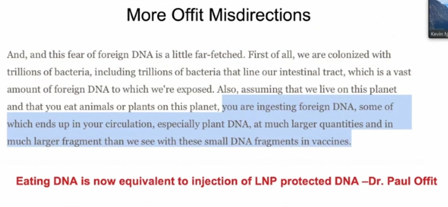 The Offit quotes are insane. Is he unaware it standard procedure to transfect mammalian cells by basically exposing them to DNA (in my day using electroporation to cross the cell wall but obviously we have LNPs to do that better now).