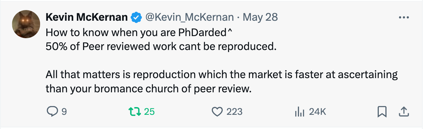 The point you need to understand here is that any NIH study section that reviews a grant application is simply a statistical subsampling of the intelligence in a given field and it tends to be enriched with people that share the same narrative. This subsampling is never as informed as all actors competing in that market place. These grants often come with strings attached that force the recipient into government ESG and DEI behavior and by definition worsen the likelihood of success the money would have found in the free market.