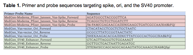 These qPCR primer sets have been screened against Pfizer, Moderna, and Janssen vaccines. The Spike assay is positive on all 3 vaccines. The Vector Origin primers amplify Pfizer and Moderna equally but have a ~10CT delay with Janssen (Different adenovirus vector).