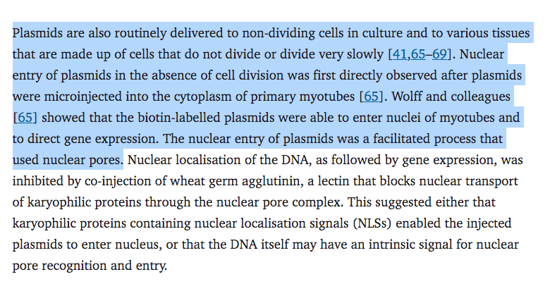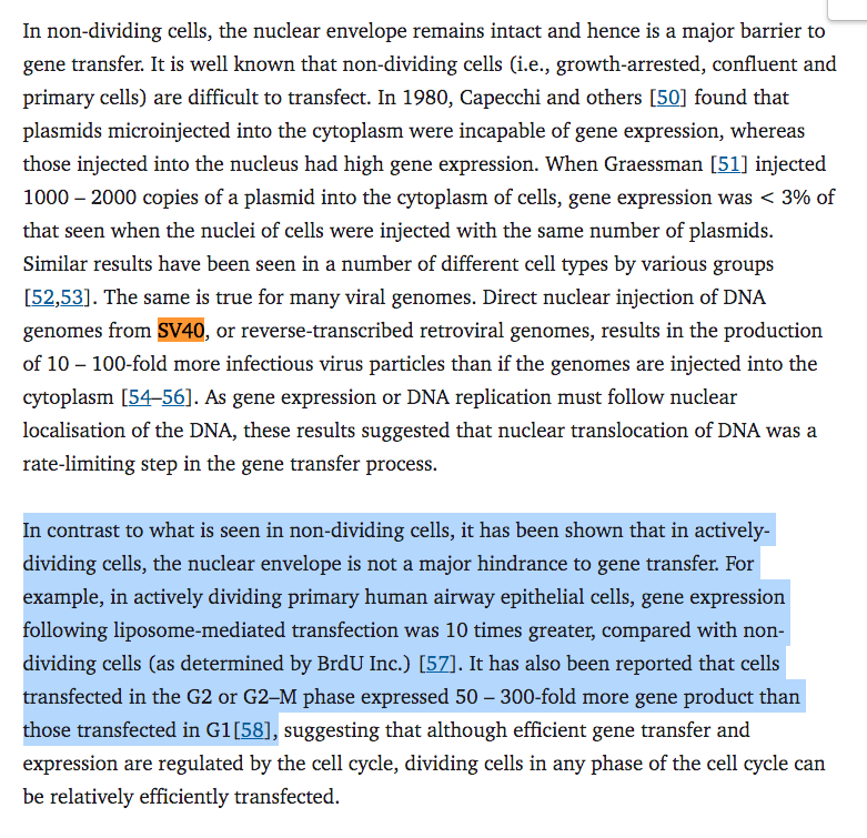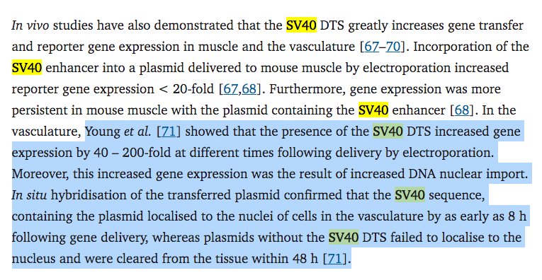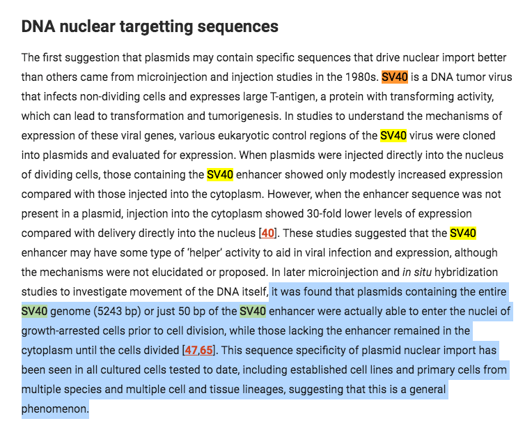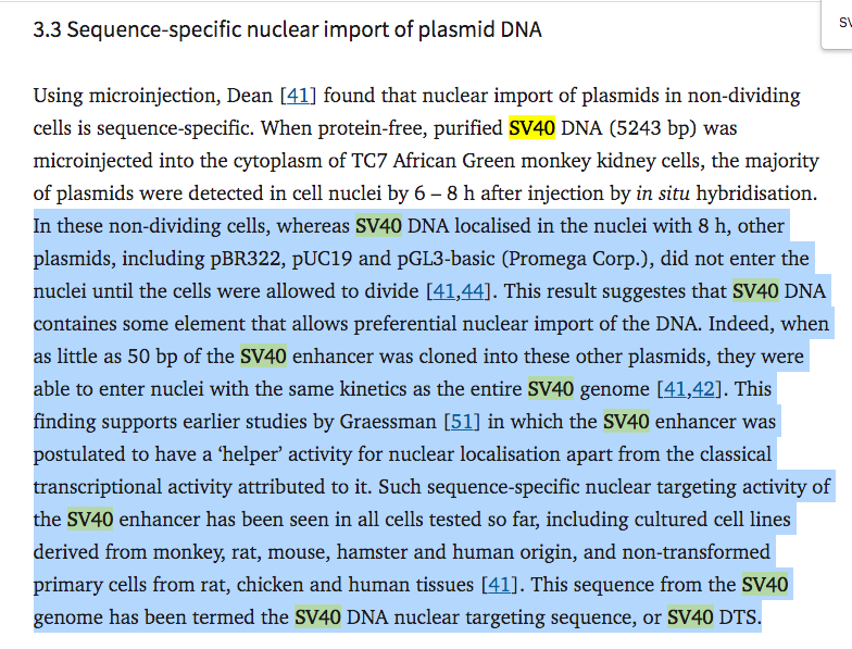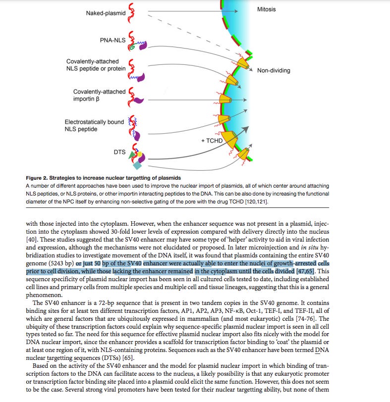 Can you believe they cited this paper? Just 50bp of the SV40 enhancer are required for nuclear entry. Remember how the ‘authorities’ keep claiming this DNA is too small to matter. Average fragment size from ONT sequencing is 214bp with some out to 3.5kb.