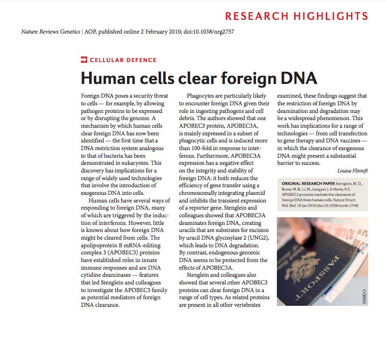 The next paper cited is from 1999 and is outdated. Recall the human genome wasnt 90% complete until 2000. This makes proving integration isn’t happening a bit tricky. More importantly, since the time of this publication many DNA sequences (SV40 Enhancers) have been discovered that shuttle DNA directly to the nucleus where APOBEC3 is not active. These are sequences that are now commonly found in Gene Therapy vectors which do not disappear in 50-90 minutes.