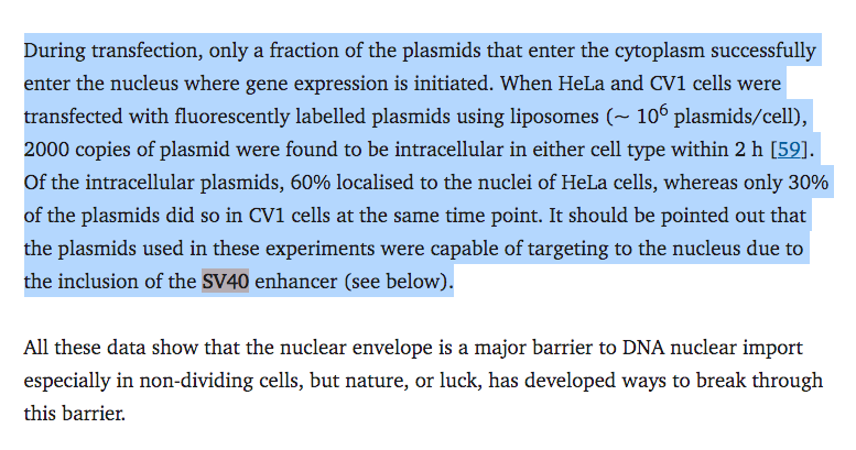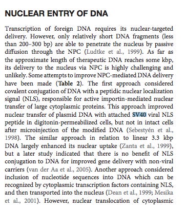 The first paper they cite (13- Durymanov et al) actually explains how SV40 Enhancers evades this! You just got citation smoke screened. They cite a paper they furiously google searched only to not realize it blows up their argument, specifically pointing out how good SV40 Enhancers are at getting into the nucleus. Thats an amateur-hour Fauci ouchie.