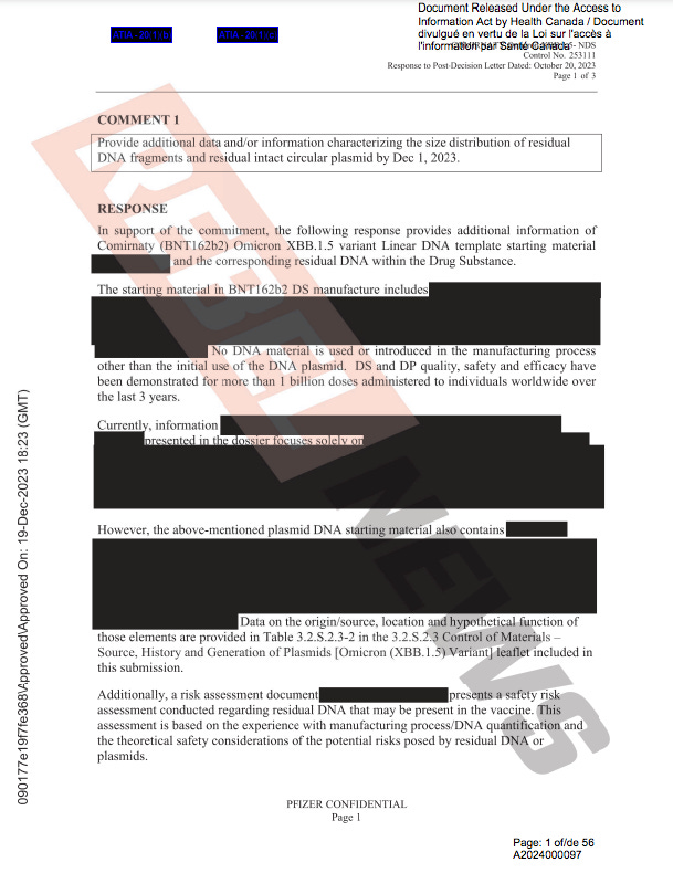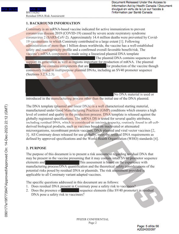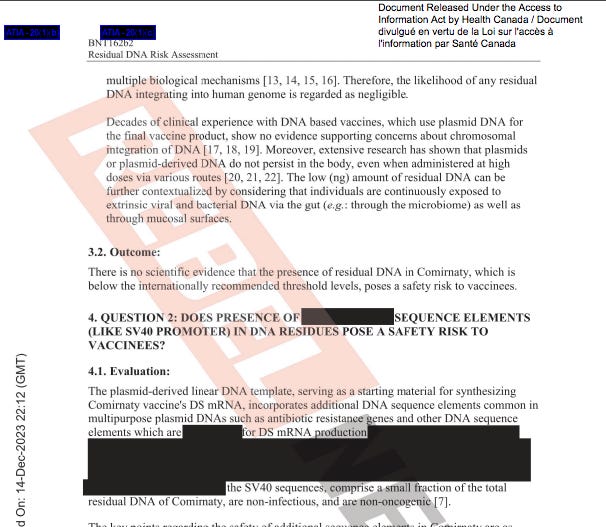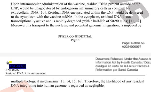 Moderna’s own patents claim the DNA is oncogenic. Straight up citation free lie from Pfizer delivered by Health Canada as a proxy.