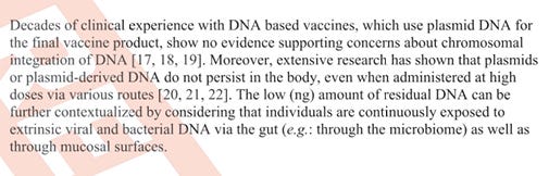 The ATIP documents moves on to cite 3 clinical trials (20,21,22) to claim the plasmid DNA cant be found after vaccination.