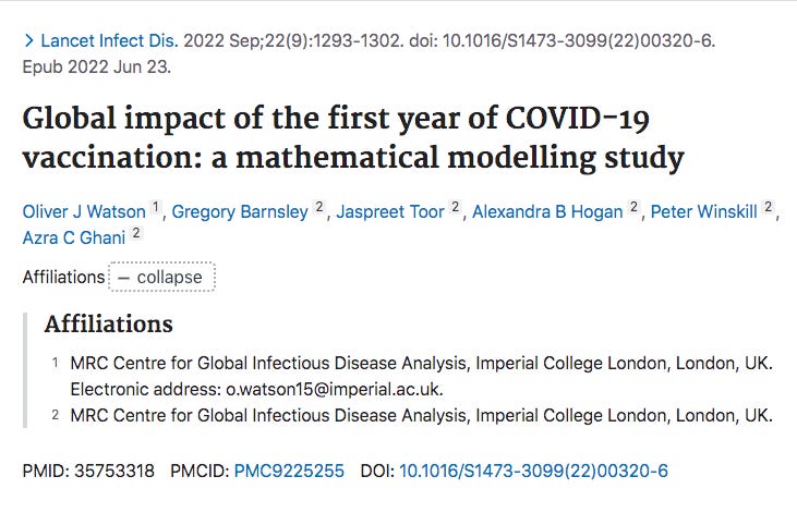 They continue to hide behind the fact that they gave out billions of these doses so they must be safe, otherwise, we'll be accused of war crimes. And look, we’ll just hire ‘Neil Ferguson and cronies’ to bake us up a model that claims we saved 14.4M lives. This study was fabricated by the Imperial College of London cult which is the first place you turn to when you need a magic trick modeling paper justifying your actions.
