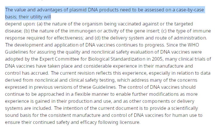 They also claim no other DNA (other than the plasmid) is introduced in the production process. This underscores that the regulators do not understand the process they are preaching. These plasmids cannot function unless propagated in a cell and that Host DNA is always in the background. When we qPCR these vials for E.coli gDNA, we in fact get signal. Its very late qPCR signal and not something I’m concerned about as its 15-20CTs behind the Vax DNA. 10CTs is 1000 fold, 20CTs is 1 Million fold so E.coli gDNA is not a significant issue but it does showcase the ineptitude of the people authoring this document.