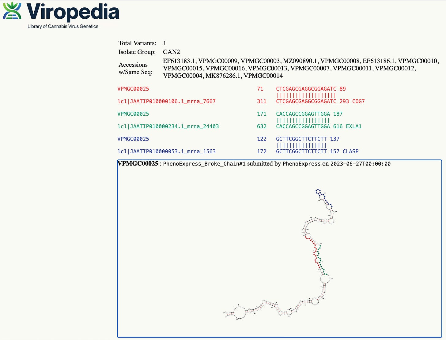 The reason to track the variants in the viroid genome is that occasionally a viroid SNP or a cannabis SNP induces a sequence homology between other host genes such as Callose Synthase . This gene codes for a protein that plugs the holes in the plasmodesmata of plant cell walls. By down regulating the mRNA for this gene, the cells become leaky and the viroid can spread cell to cell through the plasmodesmata pores.