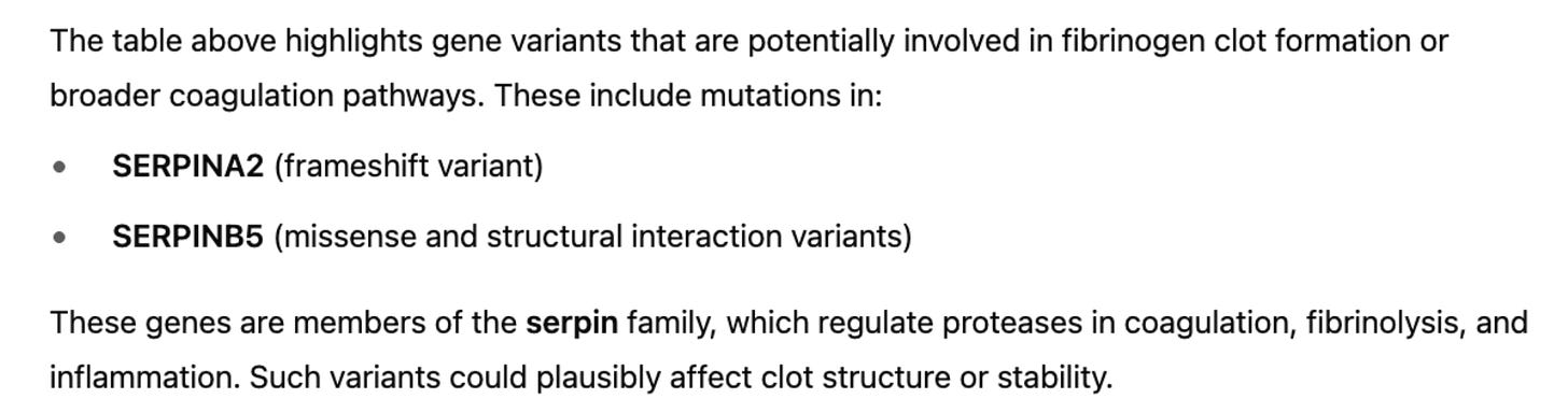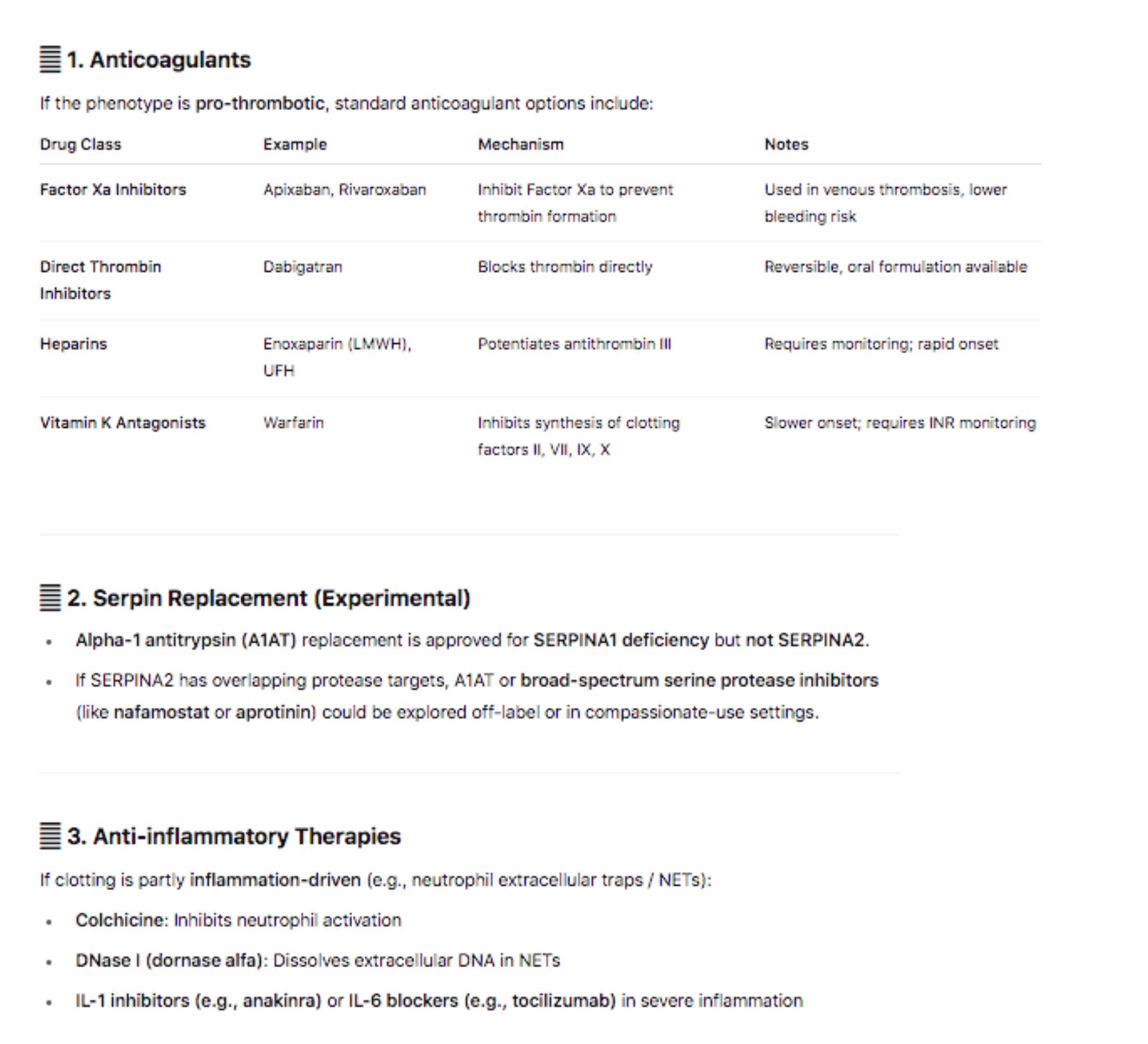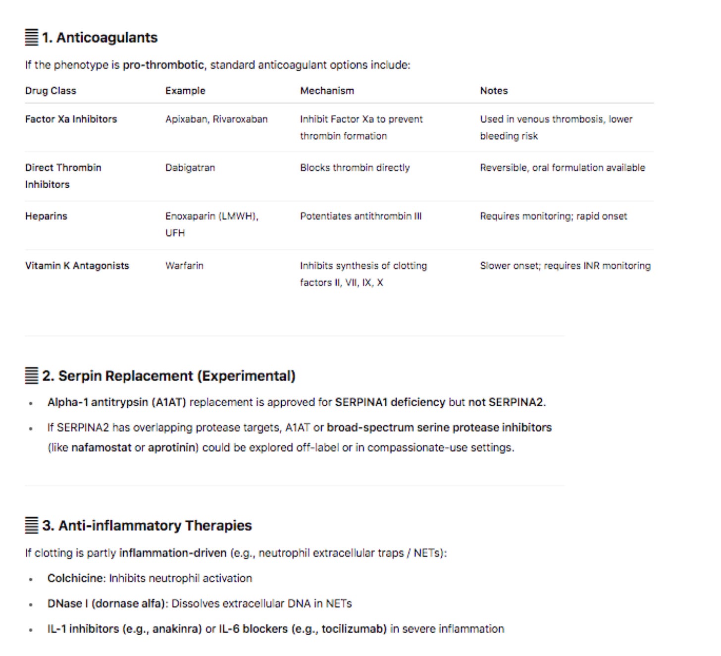 As a closing example: if you ask ChatGPT4.o what drugs one would consider for a SERPIN frameshift or Loss of Function mutation it has a few anticoagulants to suggest. This is obvious to most cardiologists. It also points to Colchicine to limit neutrophil activation and the described A1AT replacement therapy is probably not on anyones radar.