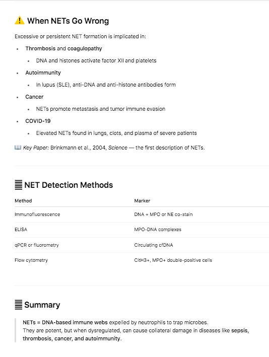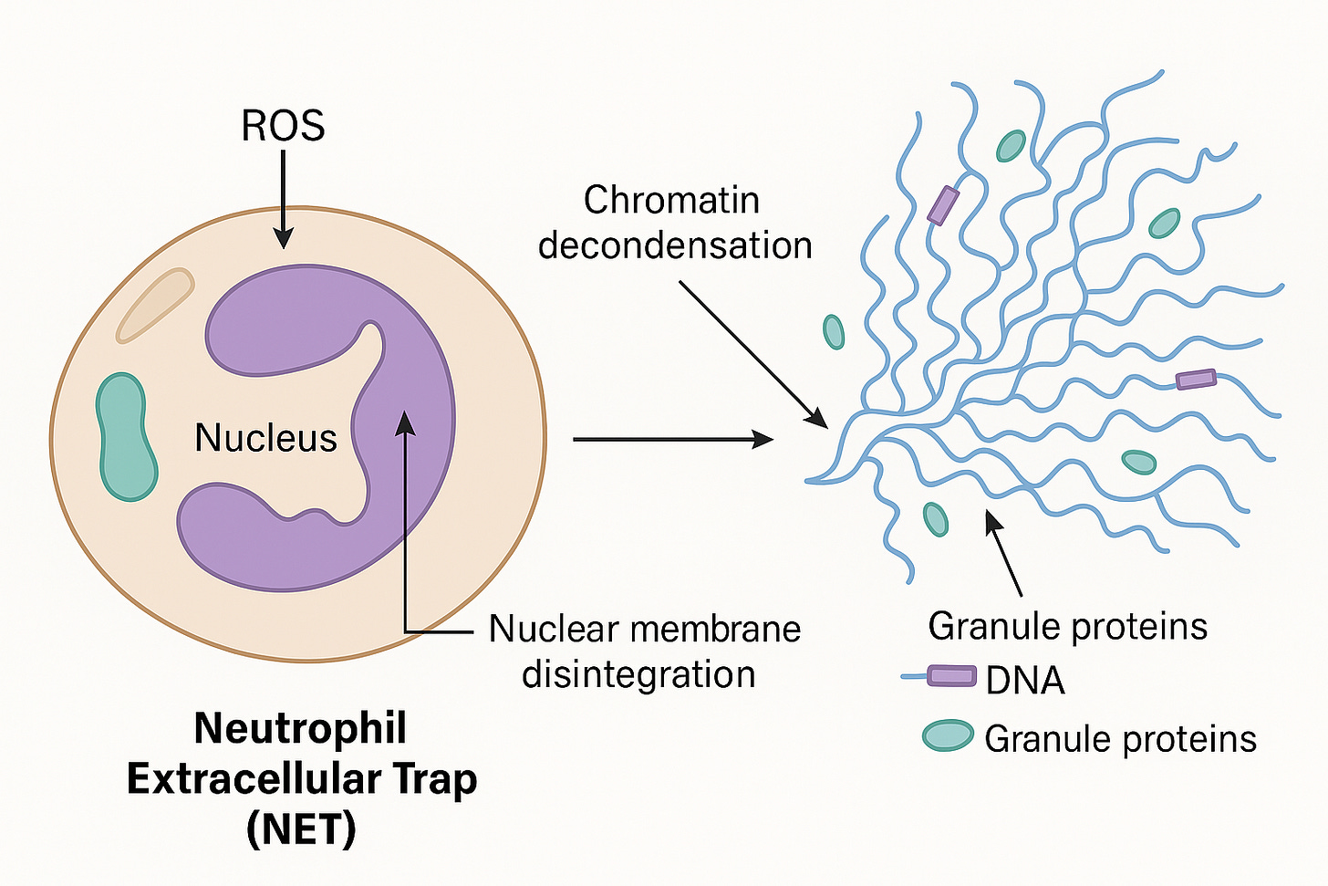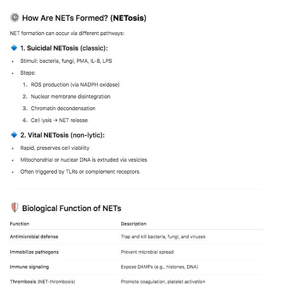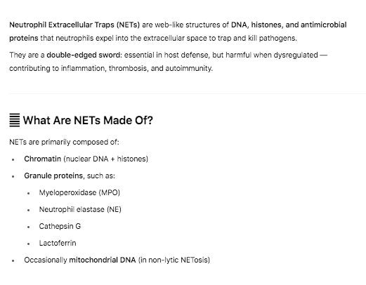 A few things to note. This NETs DNA is usually chromatin wrapped with nucleosomes and often times bacteria or other pathogens are entrapped in NETs.