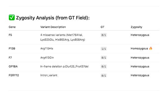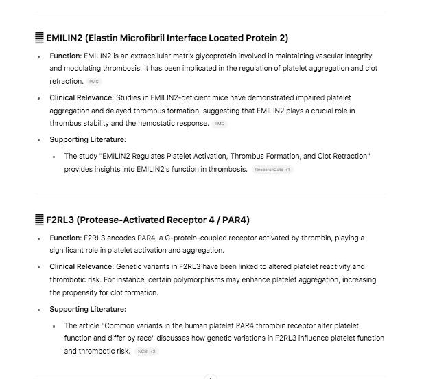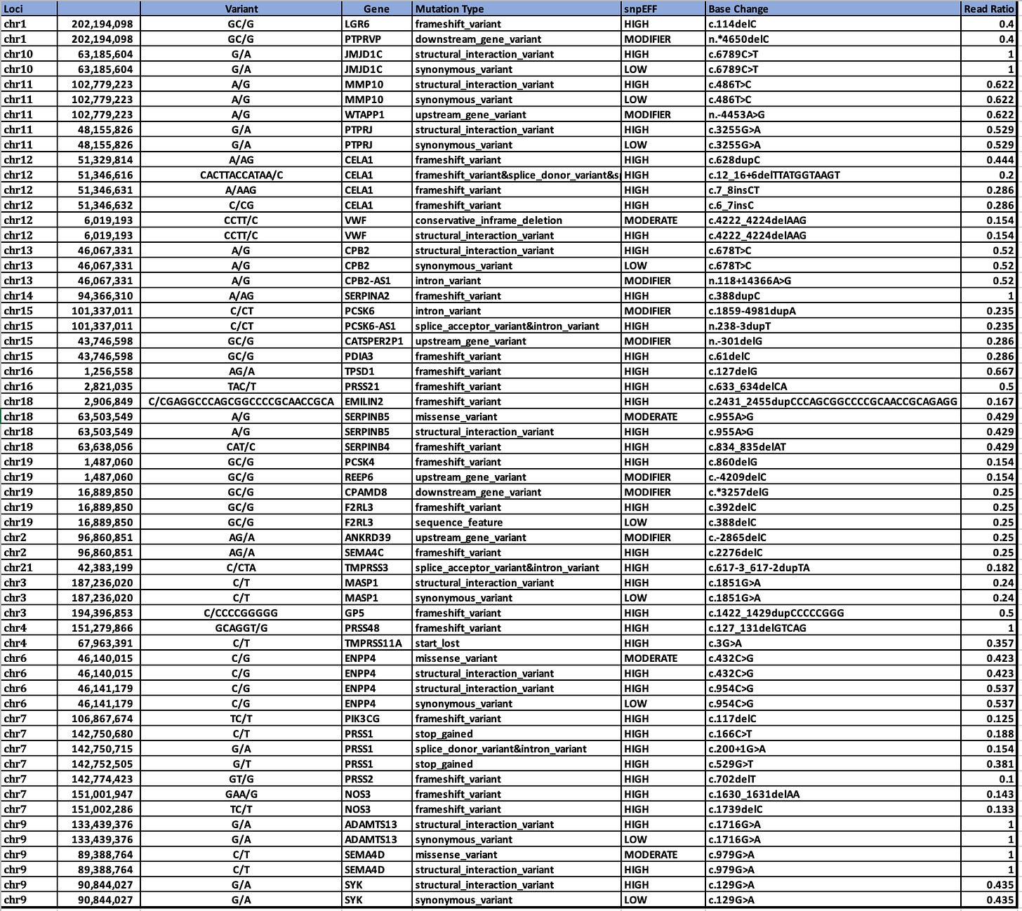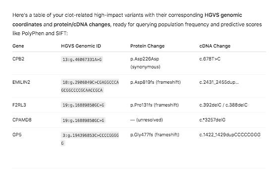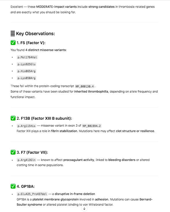 The snpEFF reports in the 27 core thrombosis related genes do display a list of MODERATE mutations of concern. In particular Factor V has 4 amino acid changing variants in the same gene some of which have been studied for inherited thrombophilia. Another missense mutation is also found in Factor XIII B subunit which is involved in Fibrin stabilization.