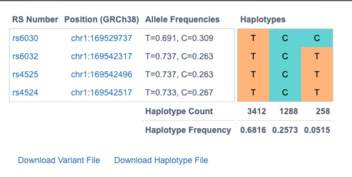 These 4 variants are known to exist in 3 dominant phases or haplogroups in the human population and we can infer which SNPs are riding on which chromosomes together. Knowing the phase of the variants is important for protein prediction as there are two copies of each gene.