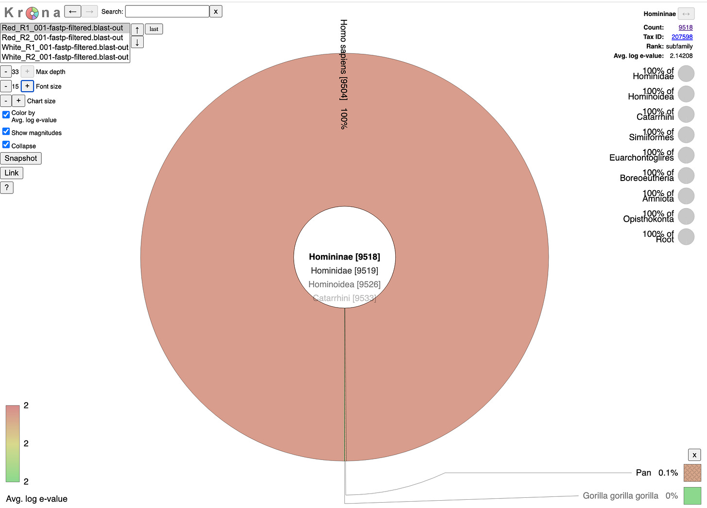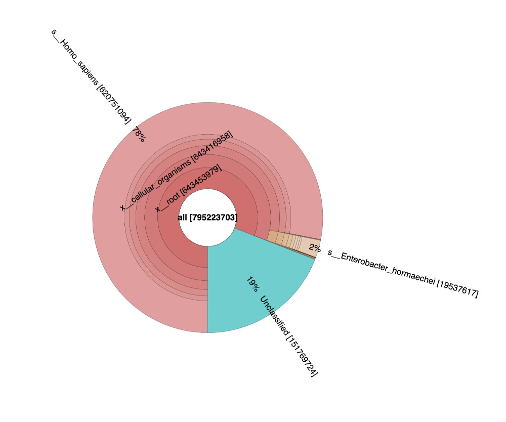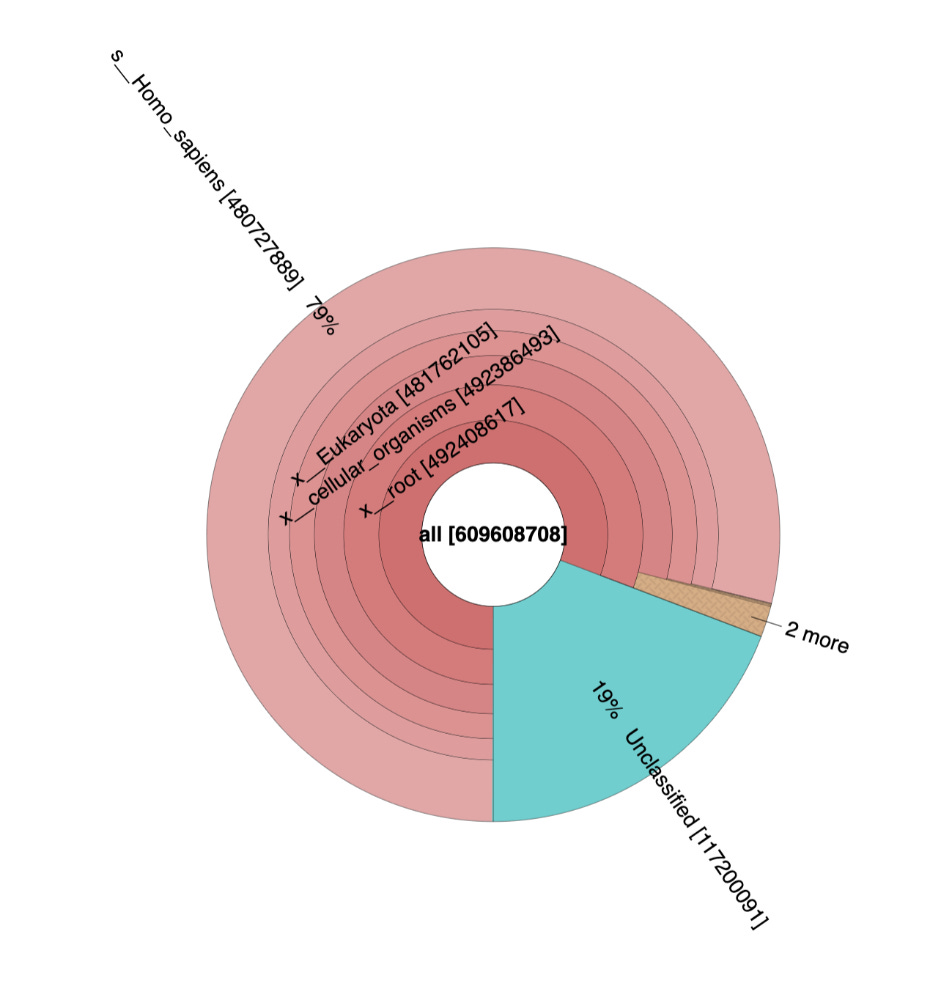 These sequencing reads exhibit a fragmentation pattern consistent with NETs. There are 620M reads that map to human in the White clot (65X coverage) and 480M reads that map to human in the red clot (52X coverage). The unclassified reads are repetitive portions of the human genome that fail short k-mer (~32mers) classification with tools like KRAKEN.