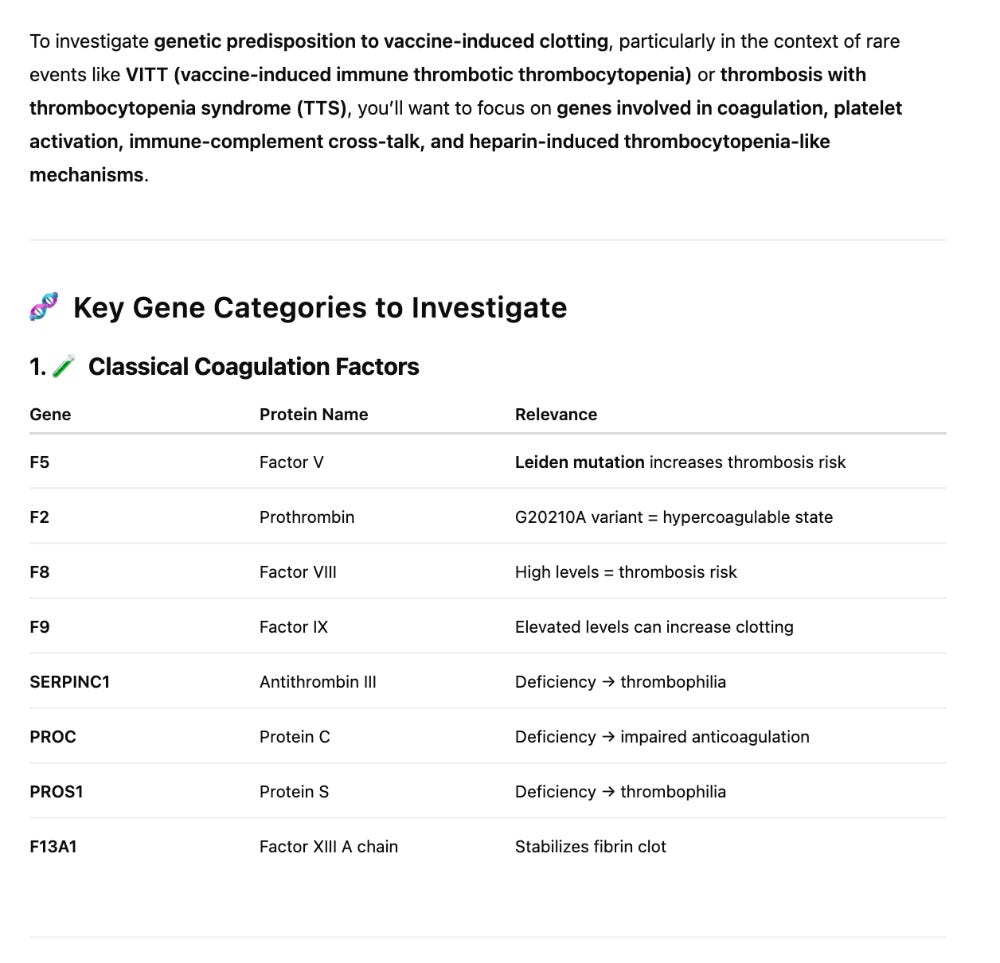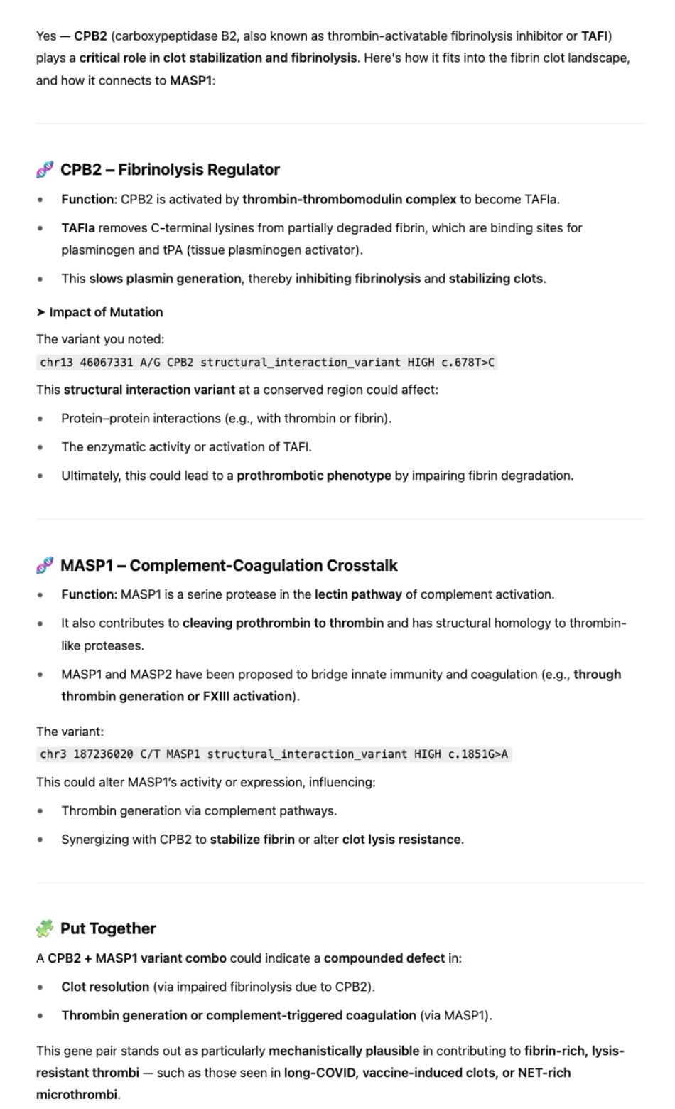The clots removed from the vaccinated are in fact human, show evidence of Neutrophil Extracellular Traps and have HIGH impact genomic variants in the clotting and amyloidogenesis cascade. We cannot claim these variants are in fact causative of such adverse events. Its equally challenging to justify having vaccines with such an extraordinary adverse event frequency and with such polymorphic adverse event profiles remaining on the market. In either case, the genetic predispositions of the injured or deceased may inform on the pathways of harm and potential treatments with those currently suffering from these injuries. We should be saving these biopsies, sequencing their RNA and DNA so we can begin to see patterns in larger cohorts. In this cohort of vaccine injured people, they often feel abandoned by the current health care system as there is no ICD10 code for their novel condition. They are frequently being mis-diagnosed with anxiety, idiosyncratic disease, or even Munchausen’s. They deserve answers. The NIH has collected over 1 billion dollars in vaccine royalty they should commit to sorting it out.