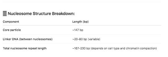 DNA that is wrapped around nucleosomes has certain length constraints and often leaves a signature in whole genome sequencing libraries. DNA wrapped in nucleosomes is usually 147 bases in length.