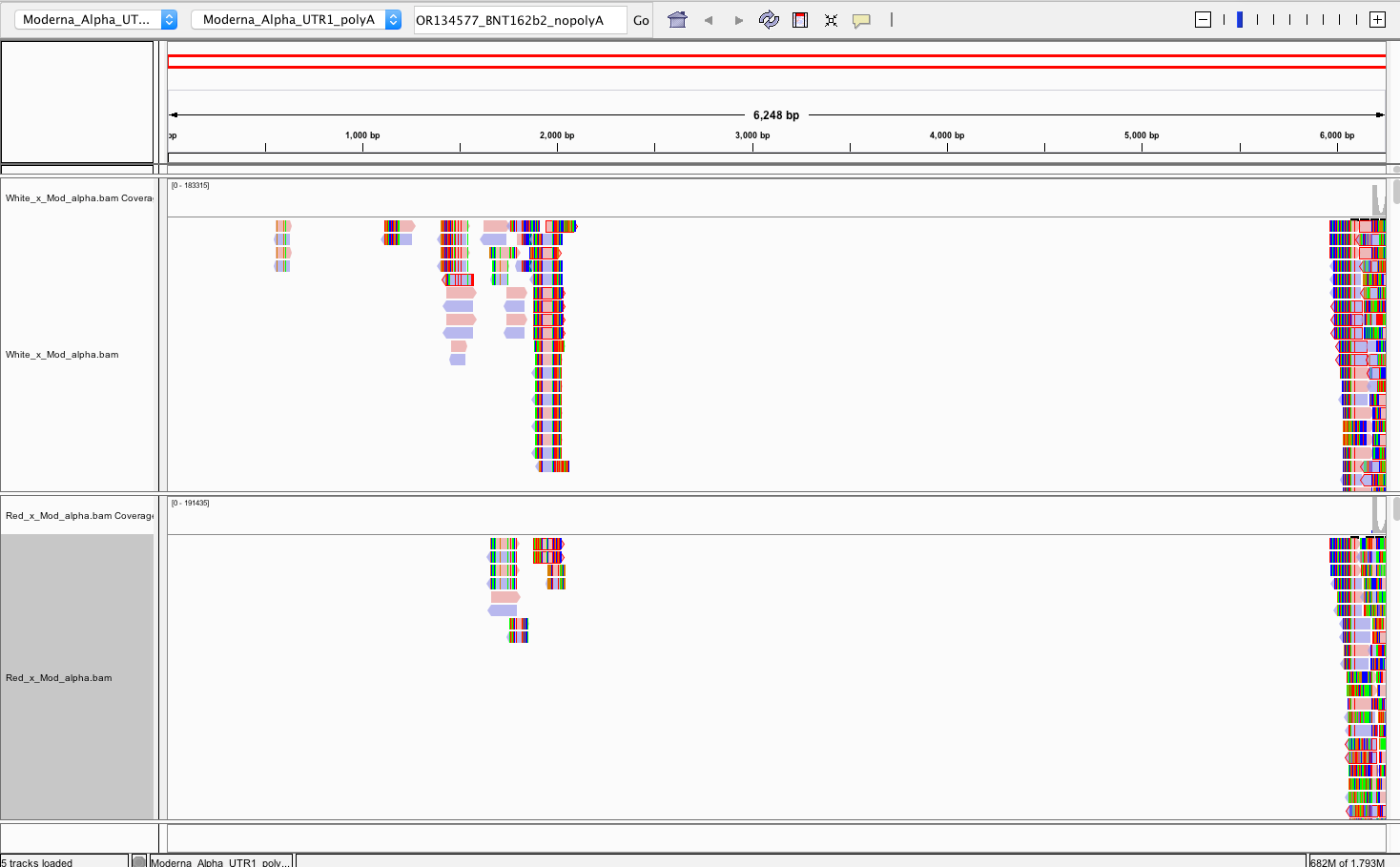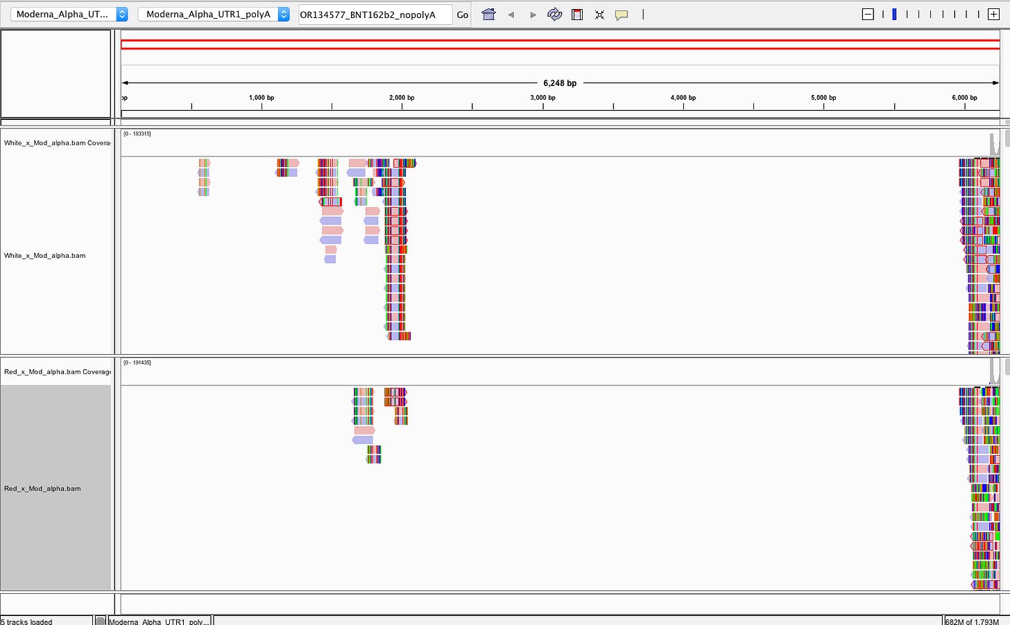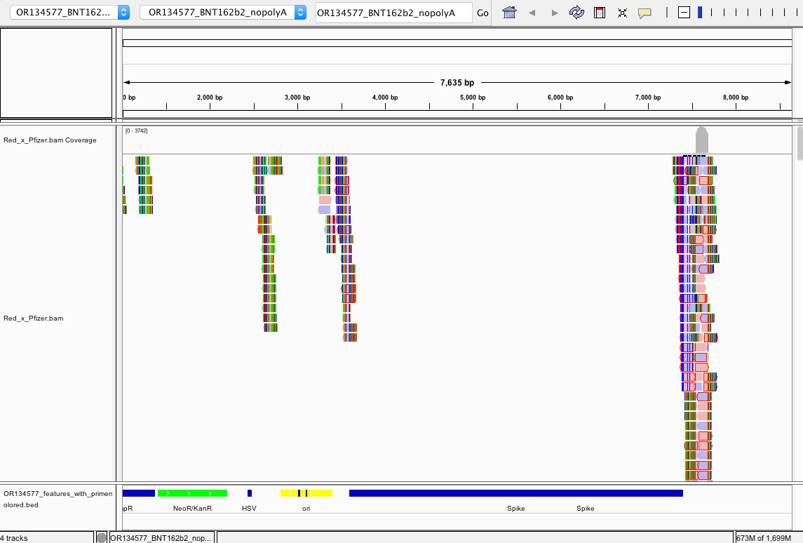 Reads that do map to Pfizer or Moderna are of poor quality with many soft-clipped reads and mismatches. Since there is no spike sequence detected, we have not searched these reads for integration events. The mostly likely regions for integration are 3’ and 5’ UTR which share human sequences and demonstrate the read pile ups you see below (Figure 8). Those require careful analysis and we don’t expect to see integration events at 50X coverage in a clot unless they were recently vaccinated. Since the vaccines contain human sequences in their UTRs, teasing apart integration events from library construction artifact can be challenging and requires further investigation.