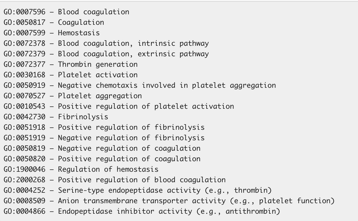 Expanding this analysis beyond the most published 27 genes in the clotting cascade, we can find 2312 gene that should be further scrutinized when using the following GO terms.