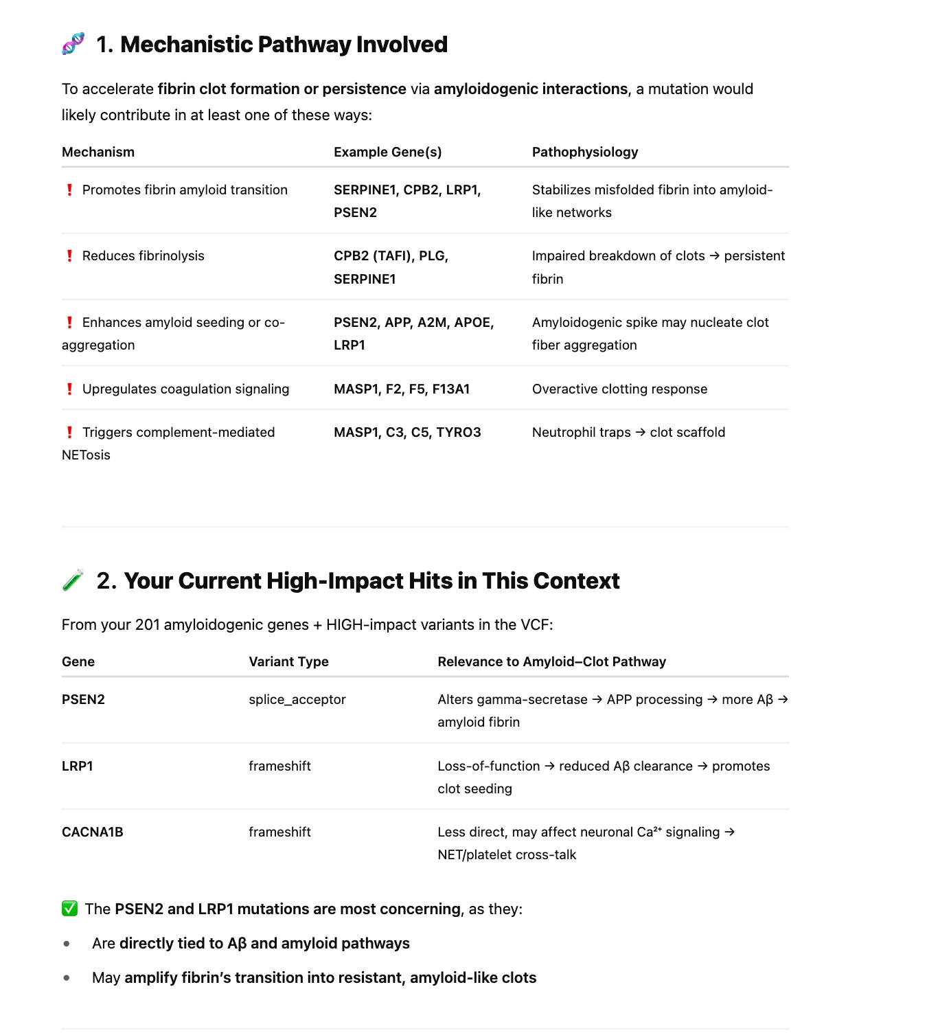 Sequencing of these clots exhibit signs of NETs often found in clotting reactions and confirmed they are in fact human samples. Highly damaging variants were found in genes involved in fibrinolysis (SERPINs, CPB2, MASP1) and amyloidogenesis (PSEN2 and LRP1). Other moderate variants were found in Factor V but these are far more speculative. More patients should be sequenced to assess if this association can be substantiated in larger cohorts and the population frequency of these damaging mutations further scrutinized.