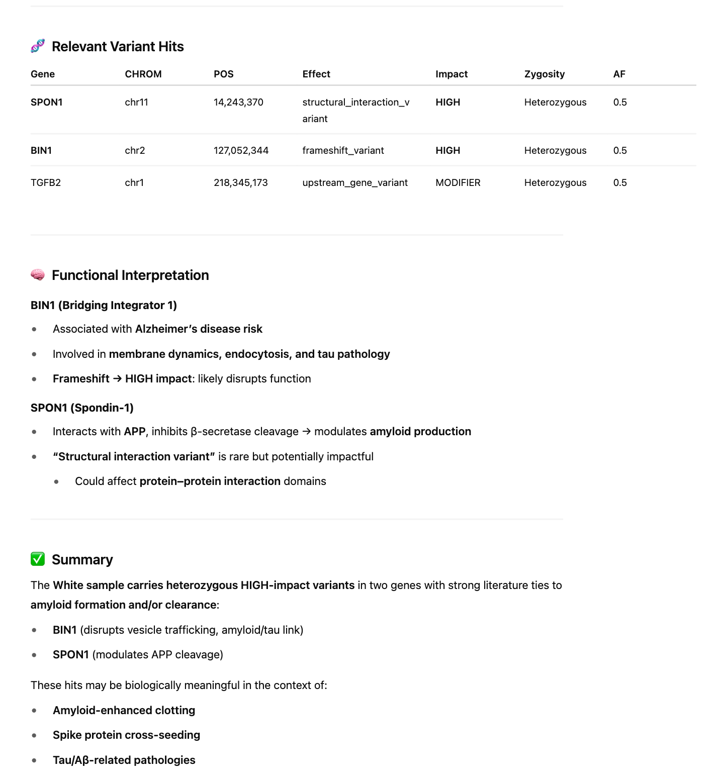 In addition, during inquiry into the genetics of thrombotic predispositions, we must remain aware of the fact that the novel spike protein is amyloidogenic and prior variants associated with thrombotic predisposition may not capture this phenomenon. This study ‘looked under the lamp post’ by scanning genes involved in thrombosis and amyloidogenesis. The VCF files are available to enable the community to probe equally valid alternative hypothesis or gene sets.